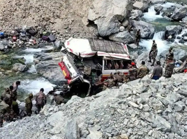 આ ઘટના થોઈસથી આશરે 25 કિમી અંતરે સર્જાઈ છે, જ્યાં સેનાની બસ શ્યોક નદીમાં આશરે 50-60 ફૂટ ખીણમાં પડી ગઈ હતી.ભારતીય સેનાએ કહ્યું છે કે ઈજાગ્રસ્ત જવાનોને શ્રેષ્ઠકક્ષાની સારવાર મળી રહે તે બાબતને સુનિશ્ચિત કરવામાં આવી રહી છે. ગંભીર રીતે ઈજાગ્રસ્ત થયેલા જવાનોને હાઈ સેન્ટર રેફર કરવા માટે વાયુ સેનાની મદદ લેવામાં આવી રહી છે. (આપની આસપાસ બનતી માહિતીના ફોટા કે વિડીયો અથવા આપની રજૂઆત કે જેને તમે સમાચારમાં સ્થાન આપવા માંગતા હોય, તેને 9328282571 ઉપર વોટ્સએપ કરો અથવા [email protected] ઉપર ઇમેઇલ કરી શકો છો. આપ ટેલિગ્રામની joinchat/SG0NAxhmbJweEQL1Ov-lkg આ લિંક ઓપન કરી ગ્રુપમાં જોડાઈ દરરોજે સમાચારની અપડેટ સમયસર મેળવી શકો છો તથા ટેલિગ્રામમાં અમારી ચેનલ પણ સબસ્ક્રાઇબ કરી શકો છો જેનું નામ છે : faceofnation1 ફેસબુકમાં પણ faceofnation.news નામથી સર્ચ કરી લાઈક કરીન સતત અપડેટ મેળવી શકો છો. ટ્વીટરમાં FaceOfNation1 નામથી સર્ચ કરી ફોલો કરી સતત અપડેટ મેળવી શકો છો).