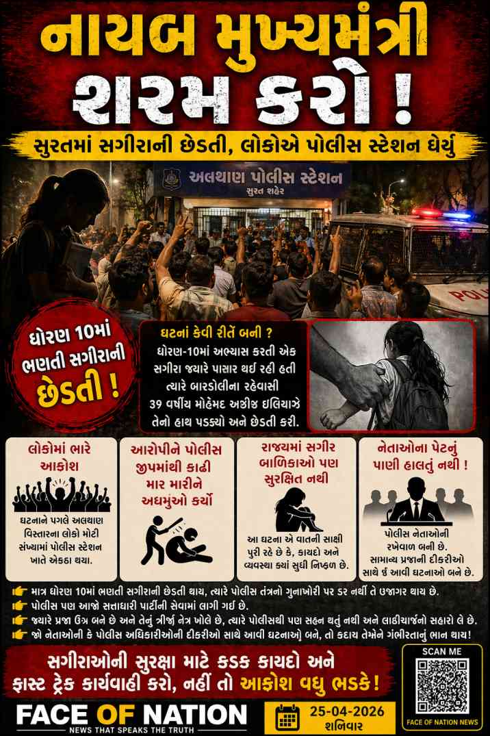 Face Of Nation 25-04-2026 : ચૂંટણી સભાઓ સંબોધતા ગુજરાતના નાયબ ગૃહમંત્રી હર્ષ સંઘવી ફાંકા ફોજદારી કરે છે અને તેમના જ વિસ્તાર સુરતમાંથી ધોરણ 10માં ભણતી સગીરાની છેડતીની ઘટના પ્રકાશમાં આવે છે. આ ઘટના એ વાતની સાક્ષી પુરે છે કે, રાજ્યમાં સગીર બાળકીઓ પણ સુરક્ષિત નથી. ખરેખર આ ઘટના ખુબ જ શરમજનક કહેવાય. છતાં નેતાઓના પેટનું પાણી હાલતું નથી અને પોલીસ આ નેતાઓની રખેવાળ બની બેઠી છે. આવી ઘટનાઓ હંમેશા સામાન્ય નાગરિકની દીકરીઓ સાથે જ બને છે. ક્યારેય આવી ઘટનાઓ નેતાઓની કે પોલીસ અધિકારીઓની દીકરીઓ સાથે બનતી નથી, તેથી કદાચ તેઓને દિવસે દિવસે વધતી આવી ઘટનાઓની ગંભીરતાનું ભાન નથી. માત્ર ધોરણ 10માં ભણતી સગીરાની છેડતી થાય ત્યારે પોલીસ તંત્રનો ગુનાખોરી ઉપર ડર નથી તે વાત ઉજાગર થાય છે. પોલીસ પણ આજે સત્તાધારી પાર્ટીની સેવામાં લાગી ગઈ છે. જયારે પ્રજા ઉગ્ર બને છે અને તેનું ત્રીજું નેત્ર ખોલે છે ત્યારે પોલીસથી પણ સહન થતું નથી અને લાઠીચાર્જની સહારો લે છે. સુરતના અલથાણ વિસ્તારમાં એક ચોંકાવનારી અને શરમજનક ઘટના સામે આવી છે, જેમાં એક સગીર વિદ્યાર્થિનીની છેડતી કરવામાં આવતા સમગ્ર વિસ્તારમાં તણાવનો માહોલ સર્જાયો છે. આ ઘટનાને પગલે સ્થાનિક લોકોમાં ભારે આક્રોશ જોવા મળ્યો છે અને મોટી સંખ્યામાં લોકો અલથાણ પોલીસ સ્ટેશન ખાતે એકઠા થઈ ગયા હતા. લોકોનો રોષ એટલો ઉગ્ર હતો કે, આરોપીને પોલીસની જીપમાંથી બહાર કાઢીને મારી મારીને અધમુઓ કરી નાખ્યો હતો. ધોરણ-10માં અભ્યાસ કરતી એક સગીરા જ્યારે પસાર થઈ રહી હતી ત્યારે બારડોલીના રહેવાસી 39 વર્ષીય મોહંમદ અઝીઝ ઇલિયાઝે તેનો હાથ પકડ્યો હતો.