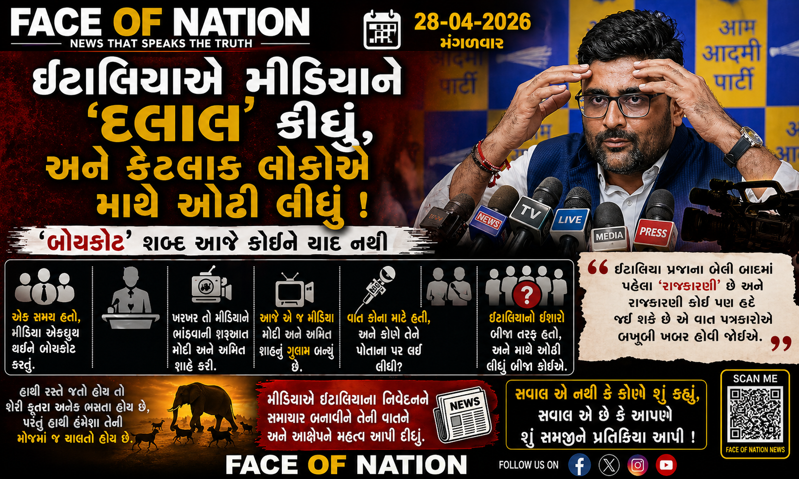 Face Of Nation 28-04-2026 : એક સમય હતો, રાજકારણીઓની મીડિયાને એલફેલ બોલવાની હિંમત નહોતી, કેમ કે મીડિયા એકજુથ થઈને તેનો બોયકોટ કરતું. ખરેખર તો મીડિયાને ભાંડવાની સૌથી વધુ શરૂઆત મોદી અને અમિત શાહે કરી અને આજે મીડિયા એ જ મોદી અને અમિત શાહનું ગુલામ હોવાનું બિરુદ મેળવી રહ્યું છે. ગોપાલ ઇટાલિયાનું નિવેદન હાલ ચર્ચામાં છે. તટસ્થતાથી વાત કરીએ તો વાત સાચી છે કે, આજે કેટલાક પત્રકારો નેતાઓના રીતસર ગુલામ બની ગયા છે અને ત્યારે જ આવા આક્ષેપો ઉઠે છે. ખરેખર ઈટાલીયા તો શું તેના જેવા પાંચસો લોકો મીડિયાને દલાલ, ચાટુકાર કે પાલતુ કુતરા પણ કેમ ના કહે. જે નથી તેને કોઈ લેવા દેવા જ નથી, પણ જે પોતાની જાતને સમજતા હોય તેમણે પ્રતિભાવ ચોક્કસ આપવો જોઈએ. આ વાત કોઈ ગોપાલ ઈટાલીયા માટેની નથી પરંતુ વાત છે, માથે ઓઢી લેવાની. જયારે કોઈ વ્યક્તિ નામ વિના કોઈના ઉપર પ્રહાર કરે છે તો, તમામ લોકો તેનો ઉત્તર આપવા દોડી જતા નથી પરંતુ તે વાત જેને લાગુ પડતી હોય તે તુરંત તેનો ઉત્તર આપવા દોડી આવે છે. ઈટાલીયા પ્રજાના બેલી બાદમાં પહેલા “રાજકારણી” છે અને રાજકારણી કોઈ પણ હદે જઈ શકે છે એ વાત પત્રકારોને બખૂબી ખબર હોવી જોઈએ. ખરેખર તો મીડિયાએ ઇટાલિયાના નિવેદનને સમાચાર બનાવીને તેની વાતને અને આક્ષેપને મહત્વ આપી દીધું. જયારે હાથી રસ્તે જતો હોય તો શેરી કુતરા અનેક ભસતા હોય છે, પરંતુ હાથી હંમેશા તેની મોજમાં જ ચાલતો હોય છે, બાકી તે ધારે તો એક જ શુંઢના ફટાકાથી કૂતરાને અધમુઓ કરી નાંખે પણ કદાચ હાથી સમજે છે કે તેની અને કુતરા વચ્ચેનું શું અંતર છે. આ વાત પ્રાણીની હતી પરંતુ મનુષ્યએ પણ આ વાત સમજવી જરૂરી છે. ખરેખર ગોપાલ ઇટાલિયાનો ઈશારો બીજા તરફ હતો અને માથે ઓઢી લીધું બીજા કોઈએ.