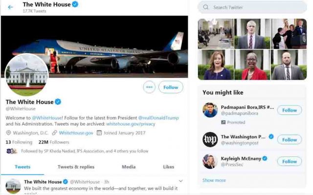 અમેરિકા અન્ય કોઈ દેશો અથવા તેના રાષ્ટ્રપતિઓના ટ્વિટર હેન્ડલને Follow કરતું નથી, પરંતુ ભારતમાં અપવાદરૂપે ટ્વીટર એકાઉન્ટને Follow કરવામાં આવ્યા હતા. હવે યુ.એસ.એ પોતાનું વલણ બદલી નાખ્યું છે અને હવે વ્હાઇટ હાઉસ યુએસની બહાર કોઈનું એકાઉન્ટ Follow કરી રહ્યું નથી. (સતત સમાચારોની અપડેટ મેળવવા આપ અમને 9328282571 નંબર ઉપર “News” લખીને વોટ્સએપ મેસેજ કરો. આપની આસપાસ બનતી ઘટનાઓ પણ અમને ફોટો-વિડિયો કે લેખિત માહિતી દ્વારા મોકલાવો. આપ અમને ફેસબુકમાં પણ લાઈક કરીને સતત અપડેટ મેળવી શકો છો. ફેસબુકમાં આપ અમને faceofnation.news નામથી સર્ચ કરી શકો છો)