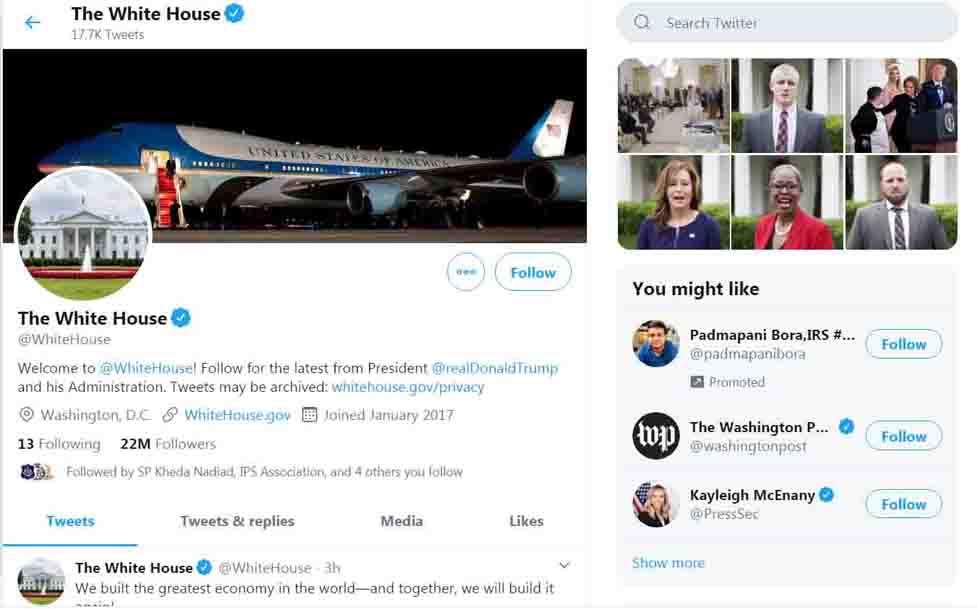 વ્હાઇટ હાઉસે જે ટ્વિટર એકાઉન્ટ્સ Follow કરવાના શરૂ કર્યા હતા તેમાં વડા પ્રધાન નરેન્દ્ર મોદી, વડા પ્રધાન કાર્યાલય, રાષ્ટ્રપતિ ભવન, યુએસમાં ભારતીય દૂતાવાસ અને ભારતમાં યુએસ દૂતાવાસનો સમાવેશ થાય છે. આ સિવાય ભારતમાં યુએસ એમ્બેસેડર કેન જસ્ટર પણ હતા. આ સાથે, વ્હાઇટ હાઉસ દ્વારા Followersની સંખ્યા 19 થઈ ગઈ હતી, જેમાં તમામ વિદેશી હેન્ડલ્સ ભારતના હતા.