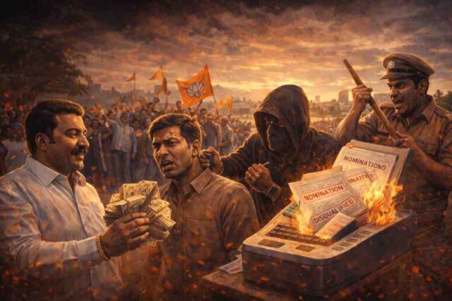 ભાજપના રાજકારણે ખરેખર રાજ્યમાં હાહાકાર મચાવી દીધો છે. પ્રજાનો આક્રોશ અને હાર ભાળી ગયેલી ભાજપે ચૂંટણીમાં એવો તમાશો કર્યો છે કે, લોકો આશ્વર્યચકિત થઇ ગયા છે. આ તમામ કામગીરી સામે ચૂંટણી પંચની ચુપકીદી ખરેખર તટસ્થતા સામે એક મોટો પ્રશ્નાર્થ ઉભો કરી રહ્યું છે. સરકારી અધિકારીઓએ પણ સત્તાધારી પાર્ટી ભાજપના ઈશારે કામકાજ કરવામાં કશું બાકી રાખ્યું નથી. તમામ મર્યાદાઓ નેવે મૂકીને એટલી નીચલી કક્ષાની રાજનીતિ કરવામાં આવી છે જે કદાચ રાજ્યના ઇતિહાસમાં નોંધાય તેમ છે. ટપોટપ અનેક ઉમેદવારોના ફોર્મ રદ્દ થવા લાગ્યા, અનેક ઉમેદવારોએ સામેથી ફોર્મ રદ્દ કર્યા.