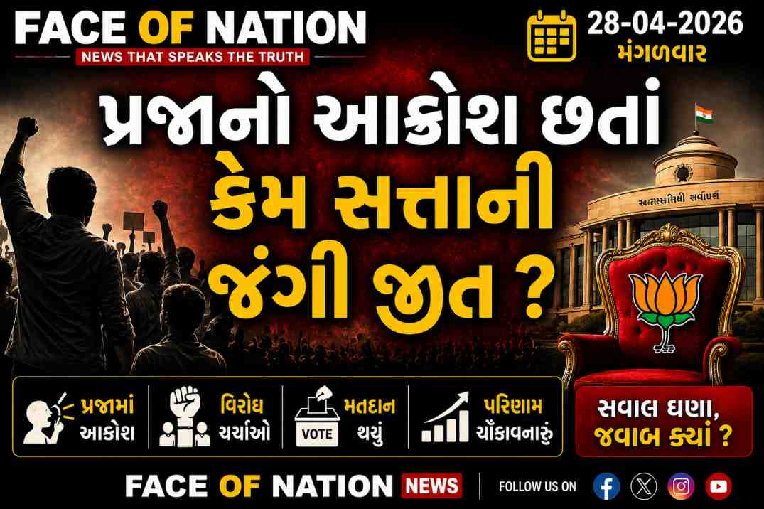 Face Of Nation 29-04-2026 : ચૂંટણી આવતા જ ગુજરાતમાં પ્રજા સત્તાધારી ભાજપ વિરુદ્ધ રોષે ભરાઈ હોય તેવા અનેક કિસ્સાઓ અને તસવીરો જોવા મળી. પાયાના પ્રશ્નોને લઇ ઠેર ઠેર પ્રજાએ ઉમેદવારો આગળ પોતાનો રોષ ઠાલવ્યો અને ઉમેદવારોનો વિરોધ કર્યો. આ વિરોધના પગલે રાજકીય નેતાઓથી માંડીને તમામ લોકોને એવું હતું કે, આ વખતે ભાજપની બેઠકોમાં ઘટાડો થશે, પરંતુ એવું થયું નહીં. EVM ખુલતા જ સત્તાધારી પક્ષ ભાજપનો વિજય થયો. ઉન્માદમાં આવી ગયેલા નેતાઓએ આ વિજયોત્સવ મનાવ્યો અને રાજ્યના લોકોએ ચર્ચાઓ કરી કે, “ક્યાંક તો ગળબળ છે”. આ ગળબળ પ્રજાના વિરોધમાં પણ હોઈ શકે અથવા તો રાજનીતિના સોગઠાં રમવામાં હોઈ શકે. સ્થાનિક સ્વરાજ્યની ચૂંટણીએ એક એવી વાત સાબિત કરી કે, પ્રજાનો વિરોધ સત્તા નક્કી નથી કરતો. અહીં પ્રજાનો આક્રોશ બનાવટી કે વિરોધ પક્ષ દ્વારા ઊભો કરવામાં આવ્યો હશે તેમ ન કહી શકાય કેમ કે, જો બનાવટી હોય કે વિરોધ પક્ષ દ્વારા ઊભો કરવામાં આવ્યો હોય તો એકાદ બે જગ્યાએ વિરોધ ઉઠે, નહીં કે રાજ્યમાં મોટાભાગના વિસ્તારોમાં એવી ઘટનાઓ સામે આવે જેમાં પ્રજાના આક્રોશનો ઉમેદવારોને સામનો કરવો પડ્યો હોય. તેવામાં સિસ્ટમ ઉપર શંકા જાય તે સ્વાભાવિક છે. લોકો હવે એમ માનતા થઇ ગયા છે કે, ઈવીએમ સાથે ચેડાં કરવામાં આવી રહ્યા છે. ખેર! ઈવીએમ અંગે સરકાર જાણે અને નેતાઓ.