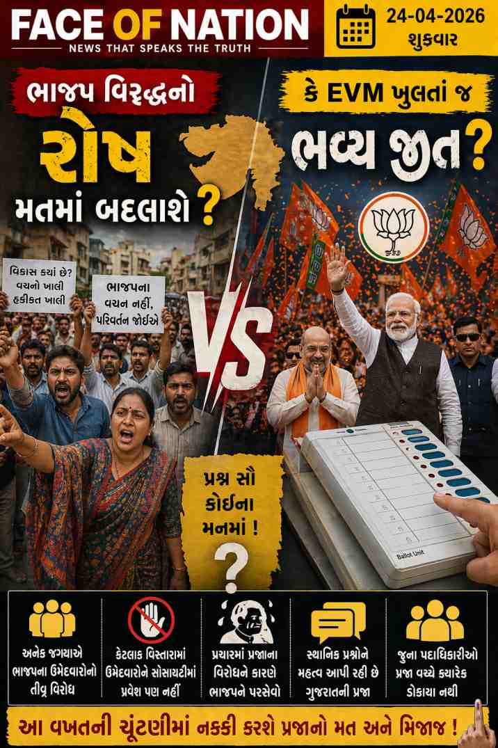 Face Of Nation 24-04-2026 : ગુજરાતમાં અનેક જગ્યાએ ભાજપના ઉમેદવારોનો વિરોધ થઇ રહ્યો છે. કેટલાક લોકોએ તો ઉમેદવારોને સોસાયટીમાં પ્રવેશ પણ આપ્યો નથી. આ વખતે ચૂંટણી પ્રચારમાં પ્રજાના વિરોધને કારણે ભાજપને પરસેવો પડી ગયો છે. આ રોષ મતમાં પ્રતિવર્તિત થશે કે ઈવીએમ ખુલતાની સાથે જ ભાજપની ભવ્ય જીત થશે તે પ્રશ્ન સૌ કોઈને છે. આ વખતની ચૂંટણી ભાજપ માટે હિન્દૂ વાદ કે મહિલાઓના અપમાન કે ગુજરાતના અપમાનના મુદ્દાઓ ઉપર આધારિત નથી. આ વખતની ચૂંટણીમાં પ્રજા સ્થાનિક પ્રશ્નોને જ મહત્વ આપી રહી છે અને ભાજપના જુના પદાધિકારીઓ પ્રજા વચ્ચે ક્યારેય ડોકાયા નથી તે અત્યારે તેમને નડી રહ્યું છે.