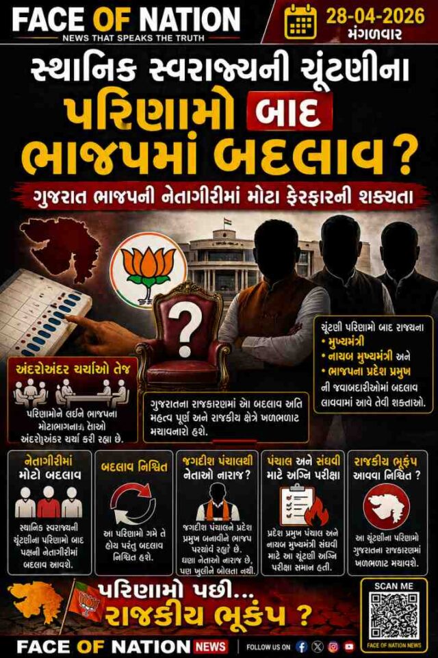 Face Of Nation 28-04-2026 : સ્થાનિક સ્વરાજ્યની ચૂંટણીના પરિણામો ભાજપની નેતાગીરીમાં મોટો બદલાવ લાવશે. આ ફેરફાર 2027ની ચૂંટણી સુધીમાં થવાની શક્યતા સેવાઈ રહી છે. હાલ રાજ્યના મોટાભાગના નેતાઓ અંદરોઅંદર ચૂંટણી પરિણામોને લઈને ચર્ચાઓ કરી રહ્યા છે. ગુજરાતના રાજકારણમાં આ બદલાવ અતિ મહત્વ પૂર્ણ અને રાજકીય ક્ષેત્રે ખળભળાટ મચાવનારો હશે. ભાજપ દ્વારા ચૂંટણીના પરિણામો બાદ રાજ્યના મુખ્યમંત્રી, નાયબ મુખ્યમંત્રી અને ભાજપના પ્રદેશ પ્રમુખની જવાબદારીઓમાં બદલાવ લાવવામાં આવે તેવી શક્યતાઓ છે. ભાજપના રાજકીય વર્તુળોમાં ચાલતી ચર્ચા પ્રમાણે સ્થાનિક સ્વરાજ્યની ચૂંટણીના પરિણામો બાદ પક્ષની નેતાગીરીમાં બદલાવ આવશે. આ પરિણામો ગમે તે હોય પરંતુ બદલાવ નિશ્ચિત હશે. ઉલ્લેખનીય છે કે, જગદીશ પંચાલને ગુજરાતના પ્રદેશ પ્રમુખ બનાવીને ભાજપ પસ્તાઈ રહ્યું છે, ઘણા નેતાઓ તેમની કામગીરીને લઈને નારાજ પણ છે, પરંતુ આ મામલે ખુલીને બોલવા કોઈ તૈયાર નથી. પ્રદેશ પ્રમુખ પંચાલ અને નાયબ મુખ્યમંત્રી સંઘવી માટે સ્થાનિક સ્વરાજ્યની ચૂંટણી અગ્નિ પરીક્ષા સમાન હતી. આ ચૂંટણી તેમના રાજકીય ભાવિ માટે મહત્વની હતી.